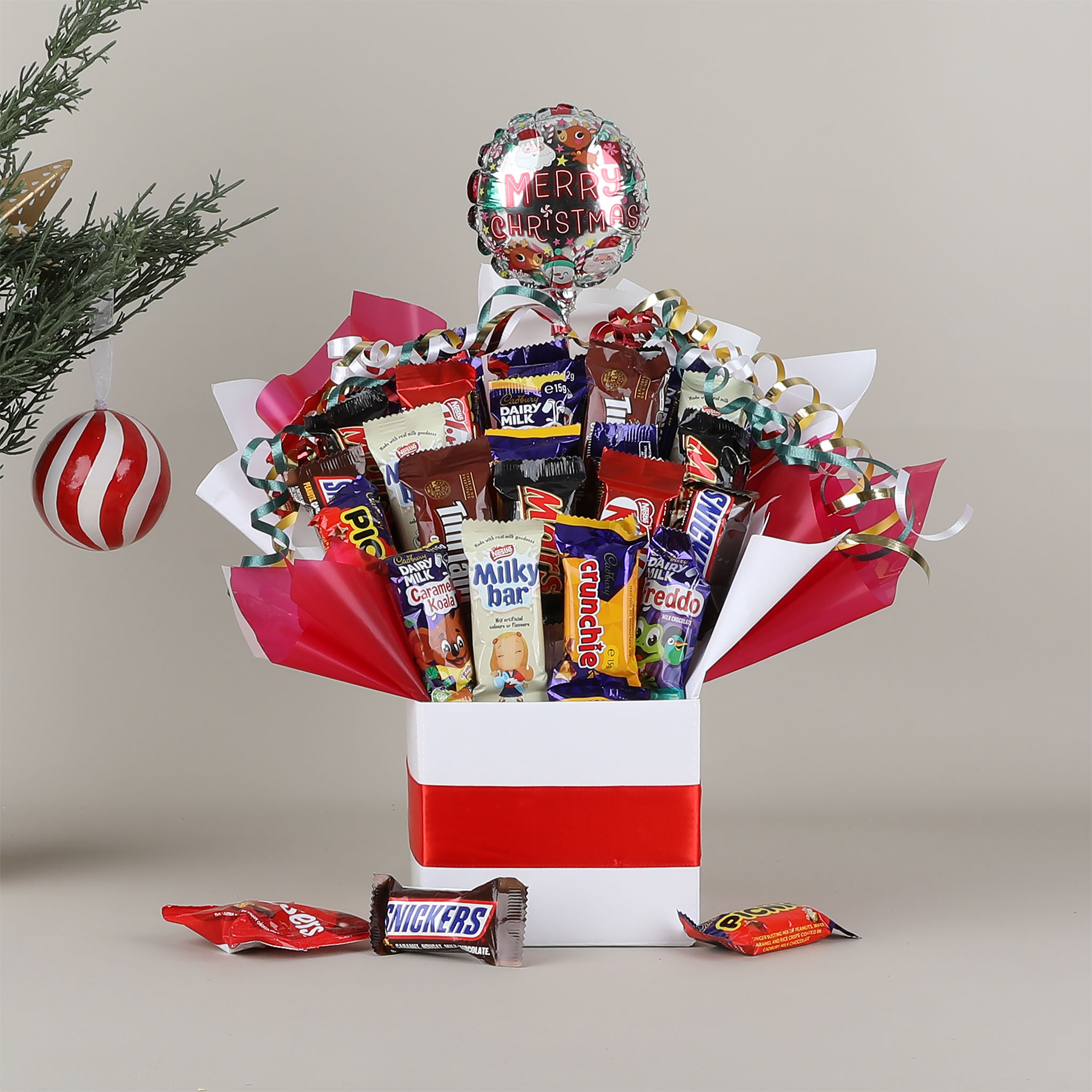 Sending Christmas Hampers and Christmas gift baskets Australia wide. The Christmas Bouquet Party Box contains 28 delicious chocolates to satisfy even the most discerning sweet tooth. (a mix of Crunchie, Caramello koala, Freddo frog, Cadbury dairy milk, Tim tam, Mars, Snickers, Picnic, Kit kat, Malteasers, and/or other various snack sizes chocolates). Great idea for Christmas for the office, family or kids to share.