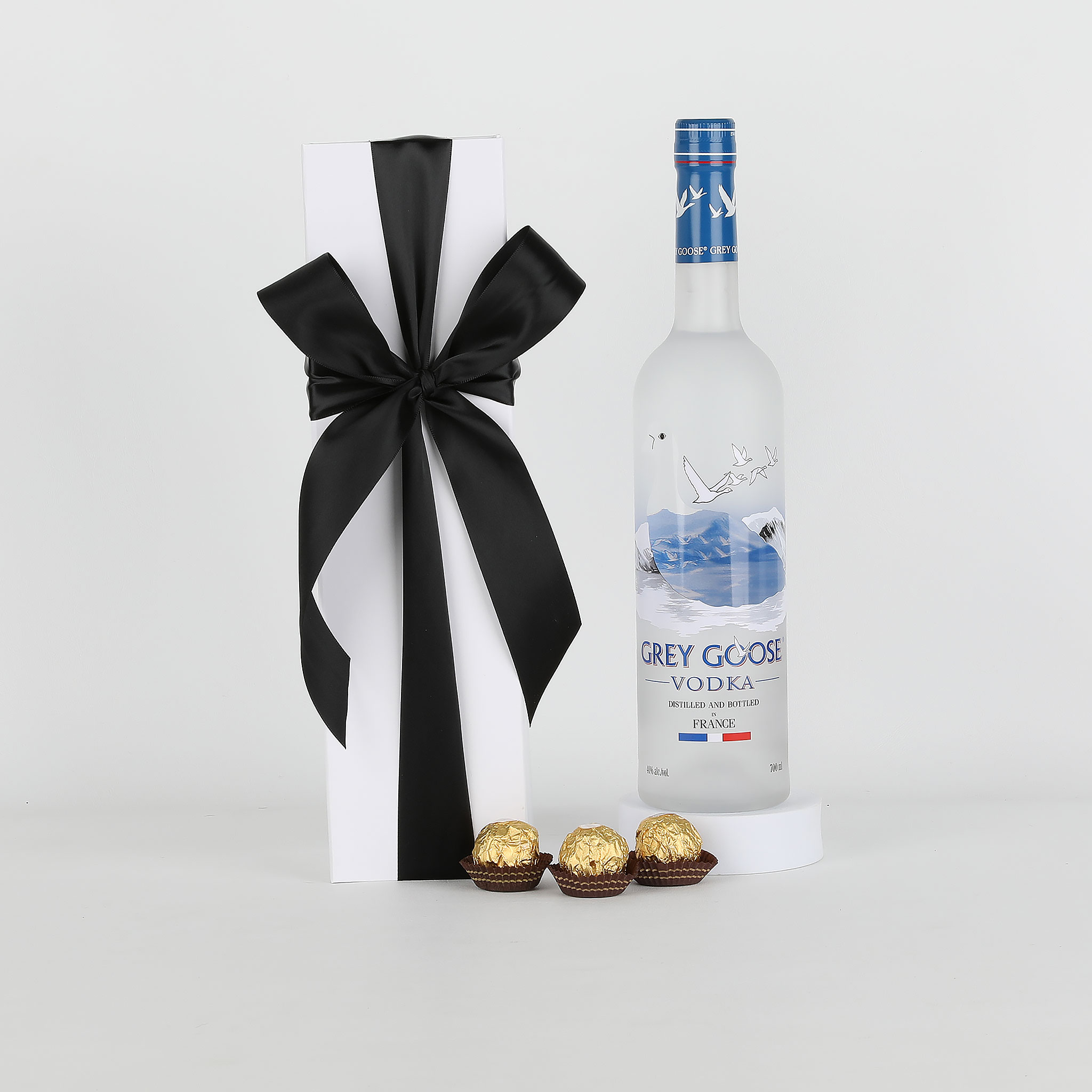 Grey Goose French Vodka with assorted chocolates and comes delivered in a black or white gift box with a card and message of your choice.