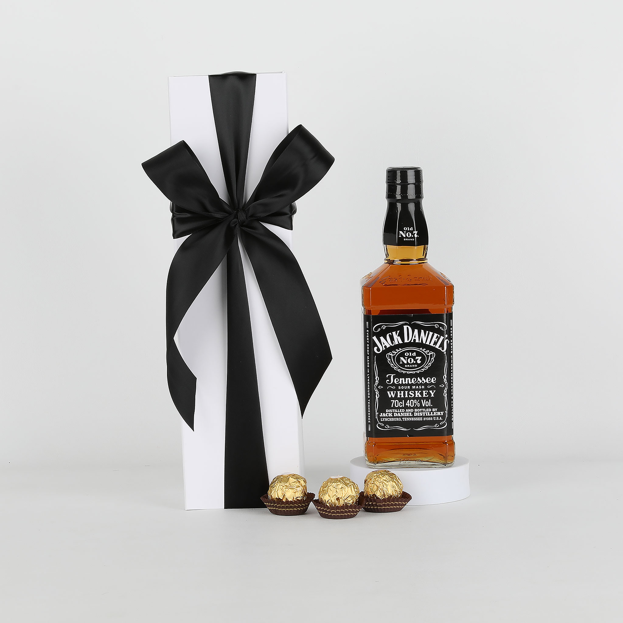 Jack Daniels Whiskey Gift Box. The one and only Tennessee Whiskey which is charcoal mellowed to deliver a smooth aroma and flavour of vanilla, toasted oak and caramel. The gift contains 1 X Jack Daniels Whiskey 700ml and assorted chocolates, presented in a luxury black or white gift box with ribbon and card.
