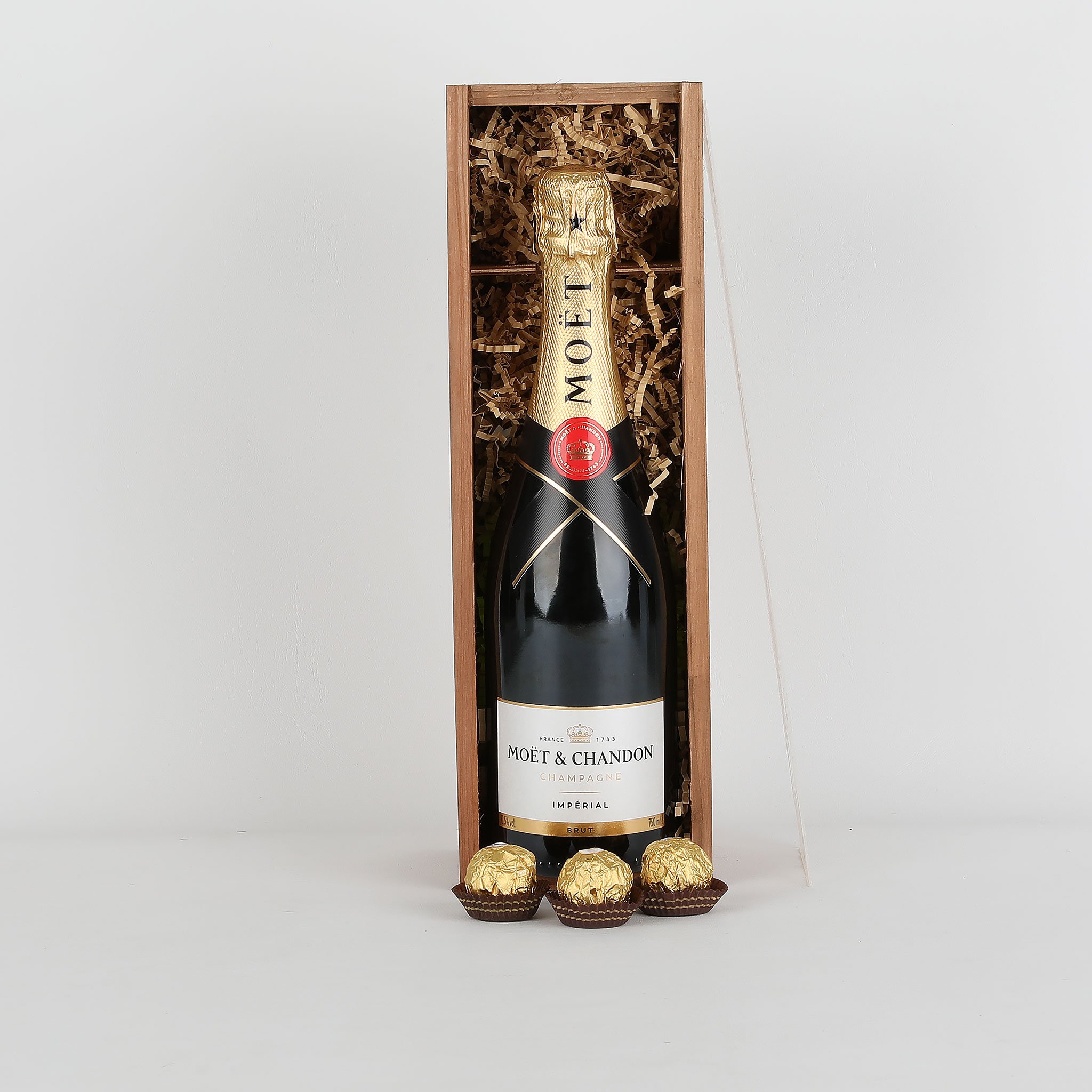 An exquisite bottle of Moet & Chandon (750ml) French champagne together with assorted chocolates. Presented in a natural wooden gift box.