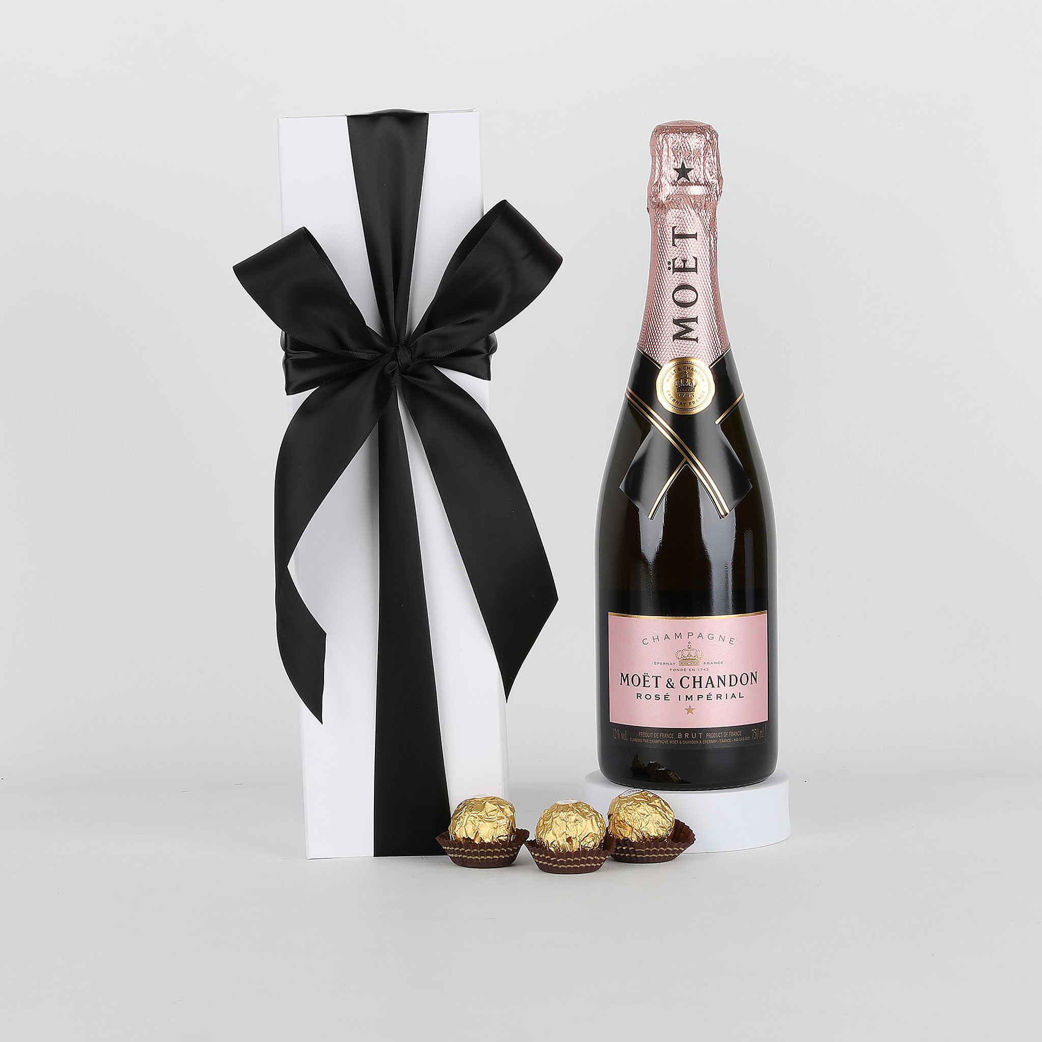 Moet & Chandon Rose Imperial Champagne with assorted chocolates comes delivered in a black or white gift box with a card and message of your choice.