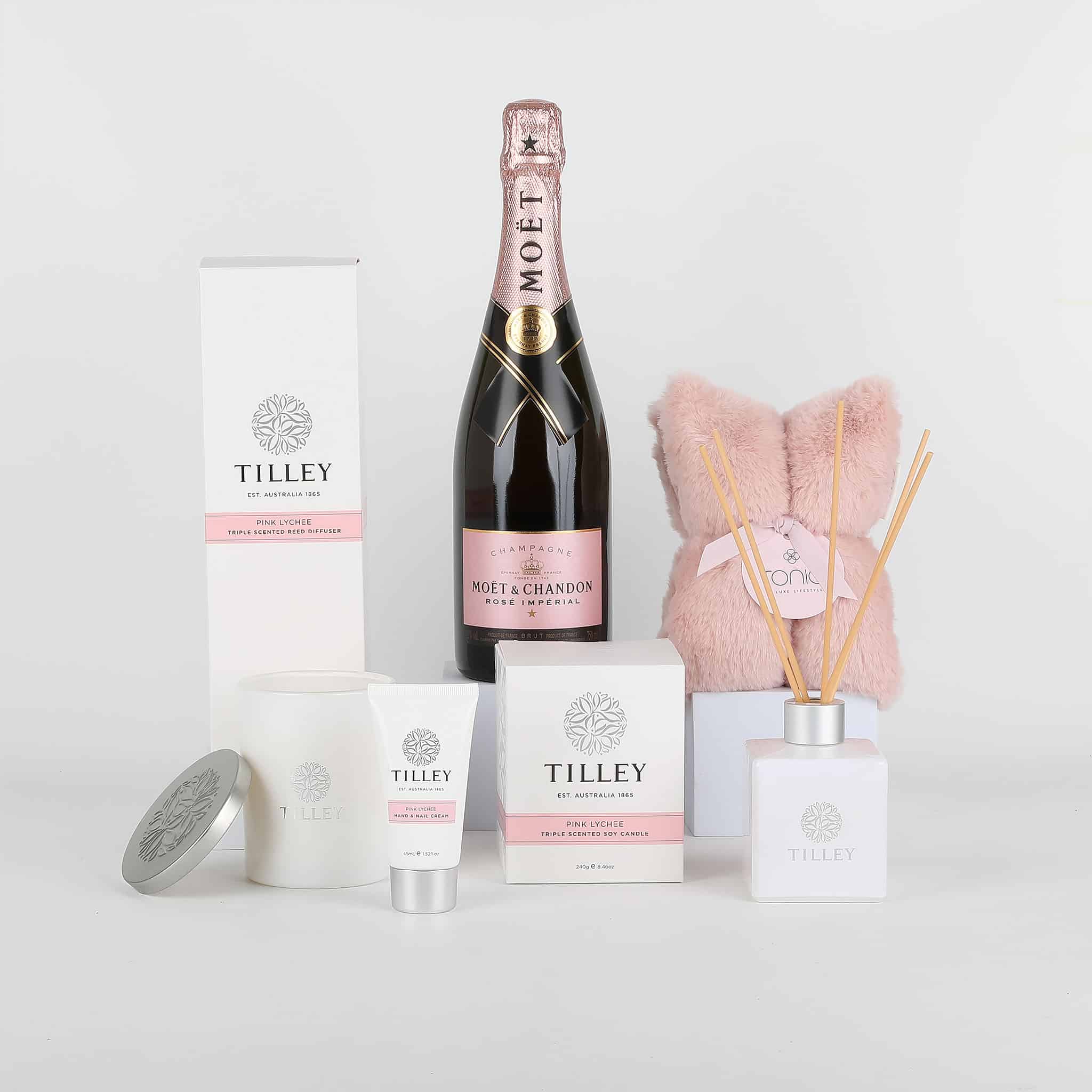 Moët & Chandon Rosé with Pink Lychee Pamper & Tonic Heat Pillow includes: