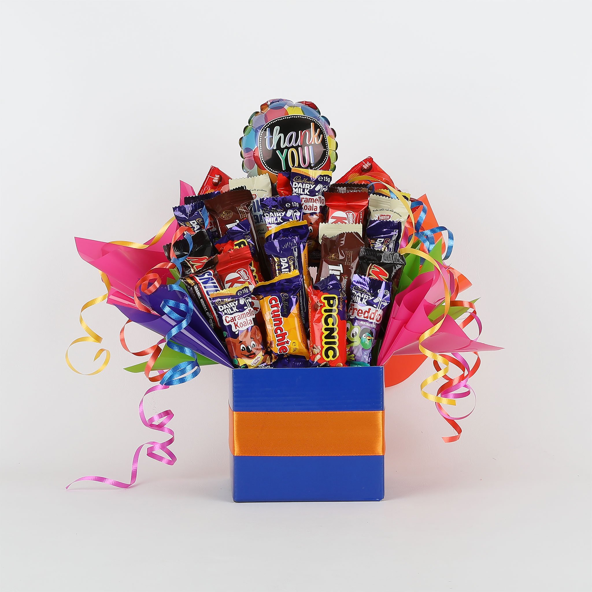 Thank You Chocolate Bouquet with Balloon contains 28 bite size chocolates from your favourite brands. This chocolate bouquet comes brightly decorated with coloured box and ribbon and streamers as well as a thank you balloon. Add a Teddy, champagne or enlarge as an option.