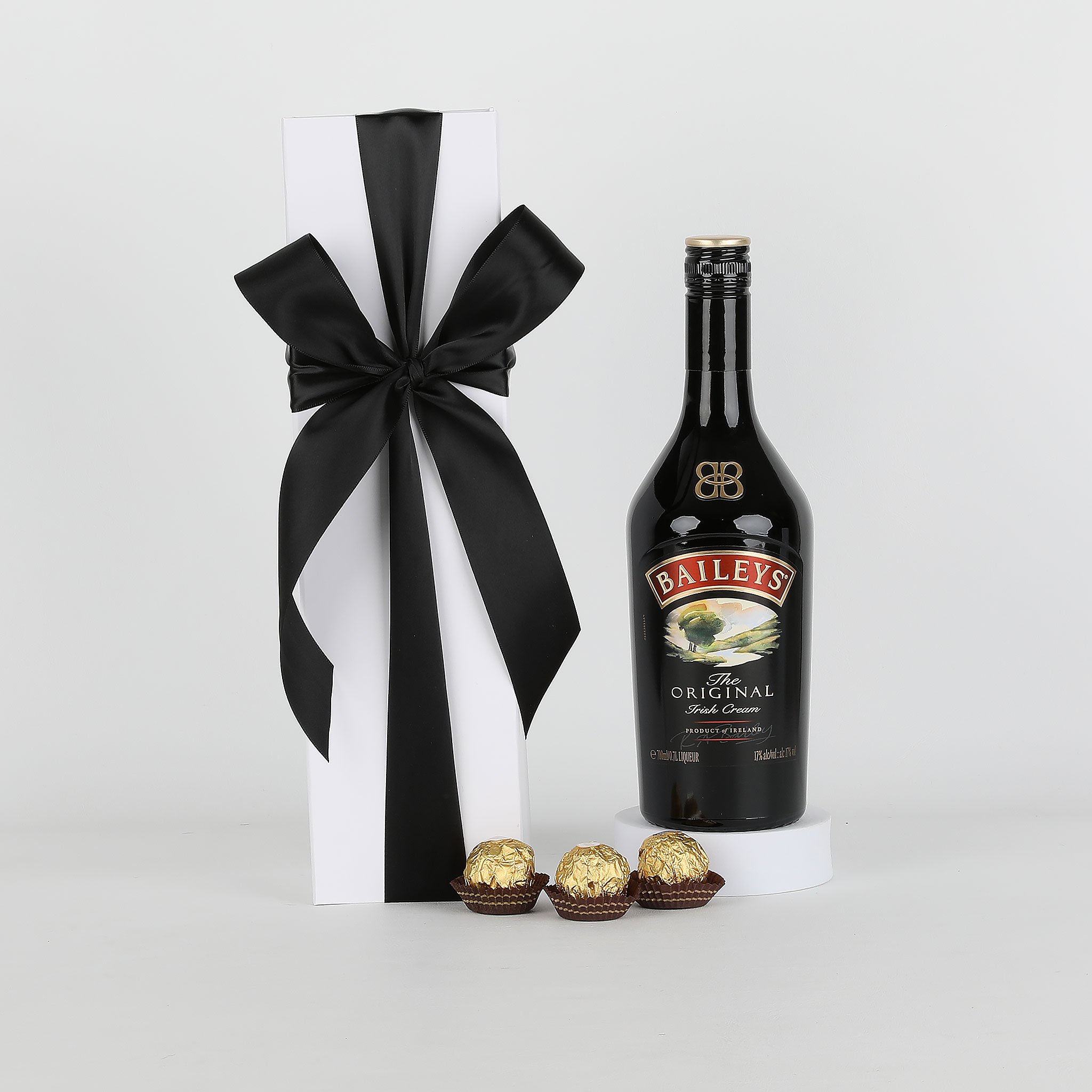 Baileys Irish Cream 700mL gift box with assorted chocolates. Presented in a luxury black or white gift box with ribbon and card.